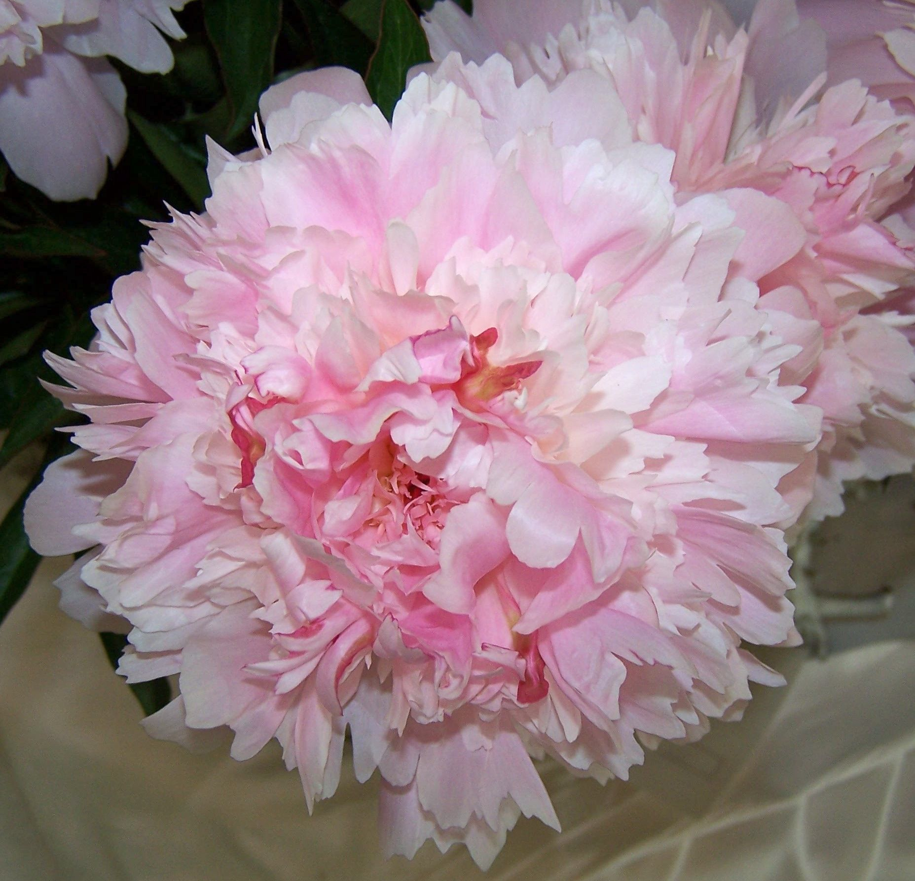 Vroege roze pioen die naar lichtroze kleurt, geeft veel stelen.