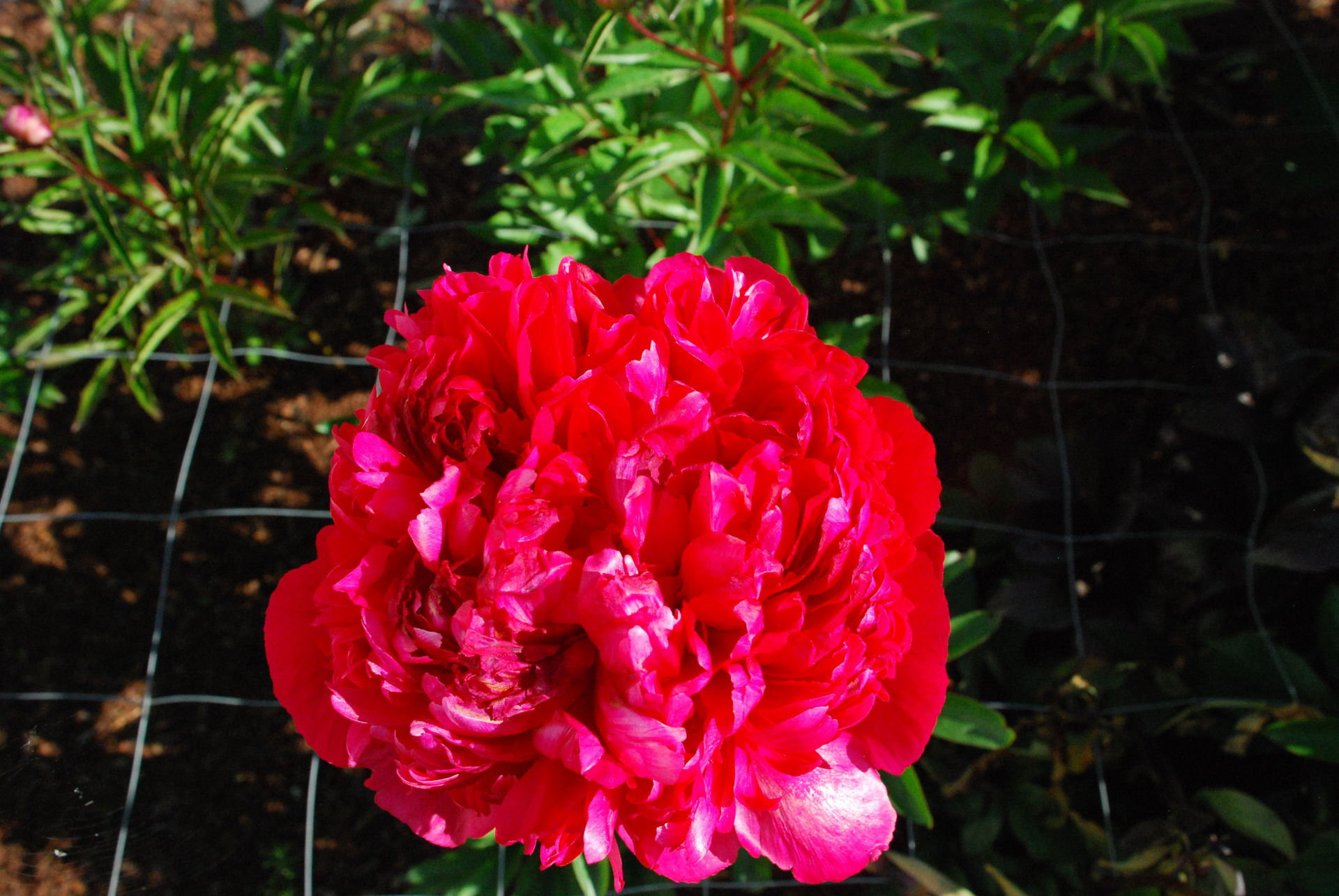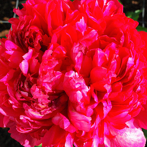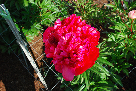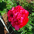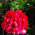 Pioen met zware dieprode bloemen. Goede snijpioen met stevige stelen.