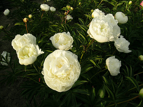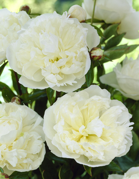 Rijkbloeiende witte pioen met een heerlijke geur. Enorm populaire snijbloem.