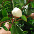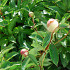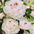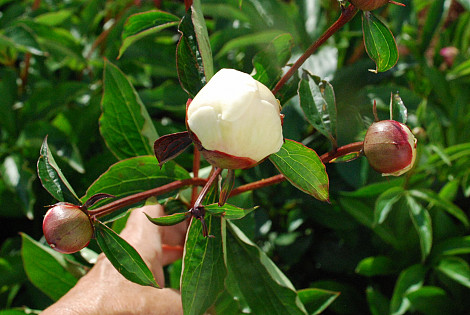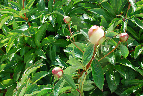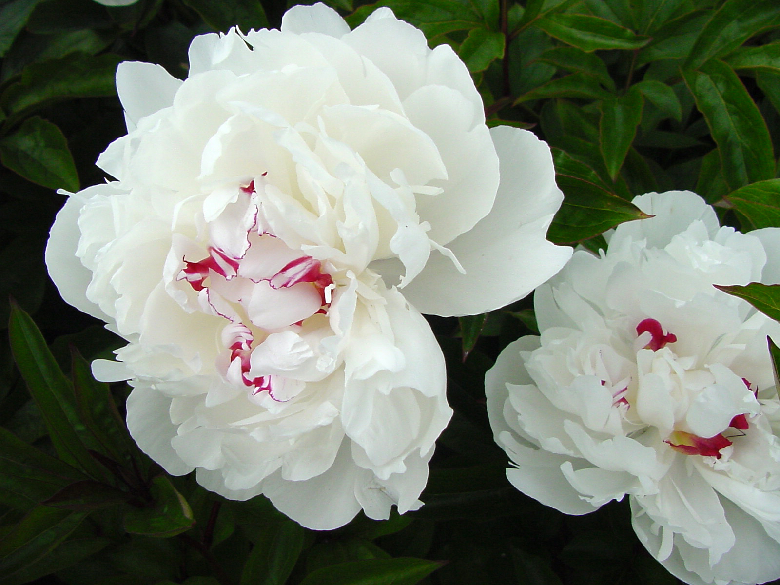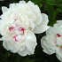 Rijkbloeiende pioen met zoetgeurende bloemen met een witte bloem met rode vlekken in het hart.