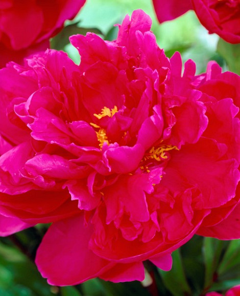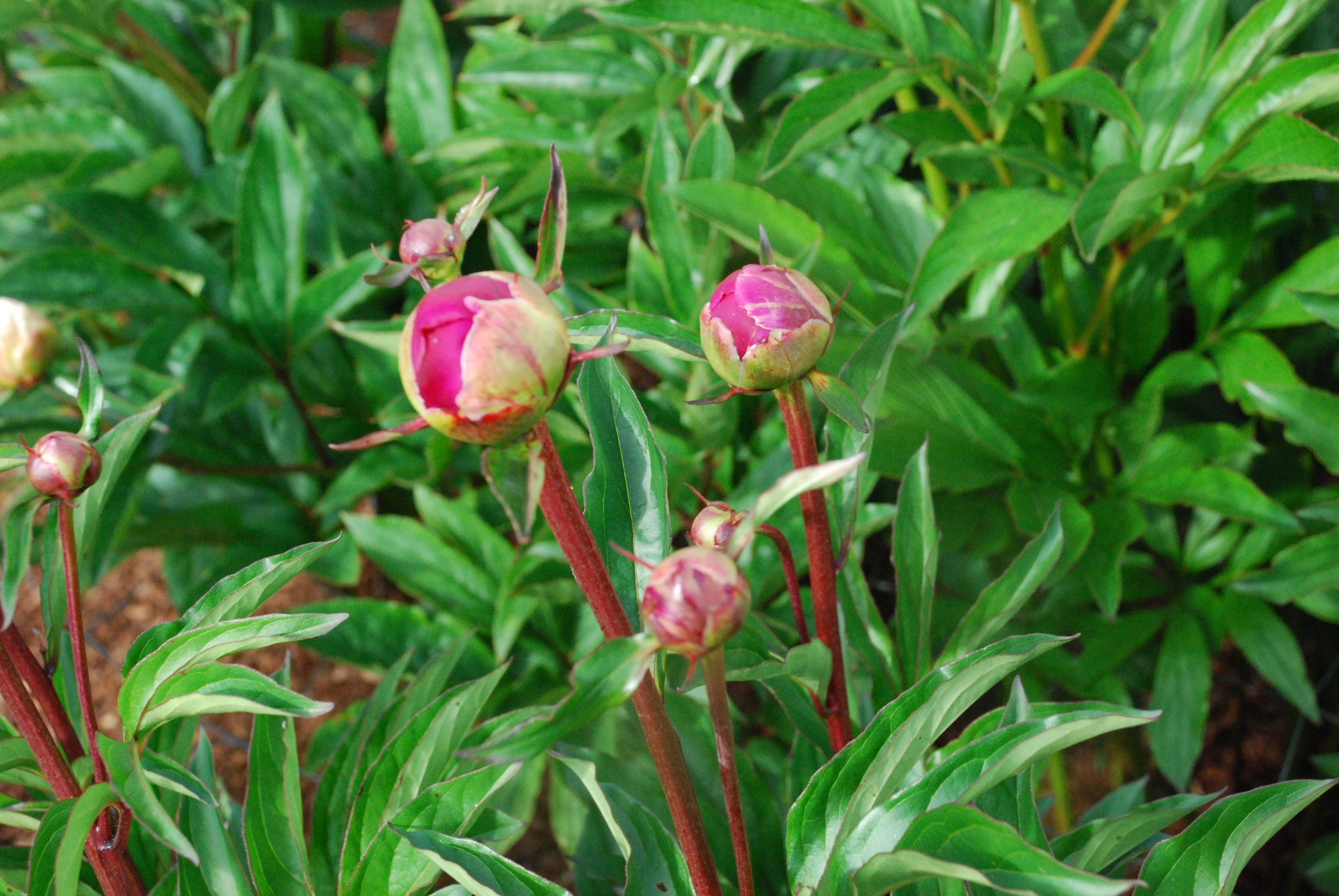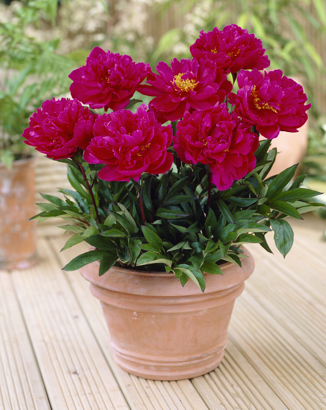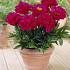 Donker karmijnrode bloemen met een paarse gloed. Stevige stelen.