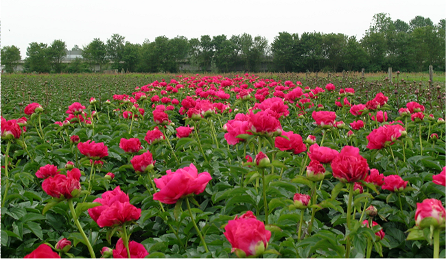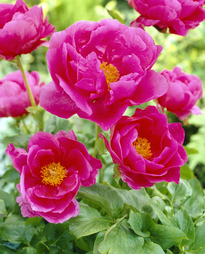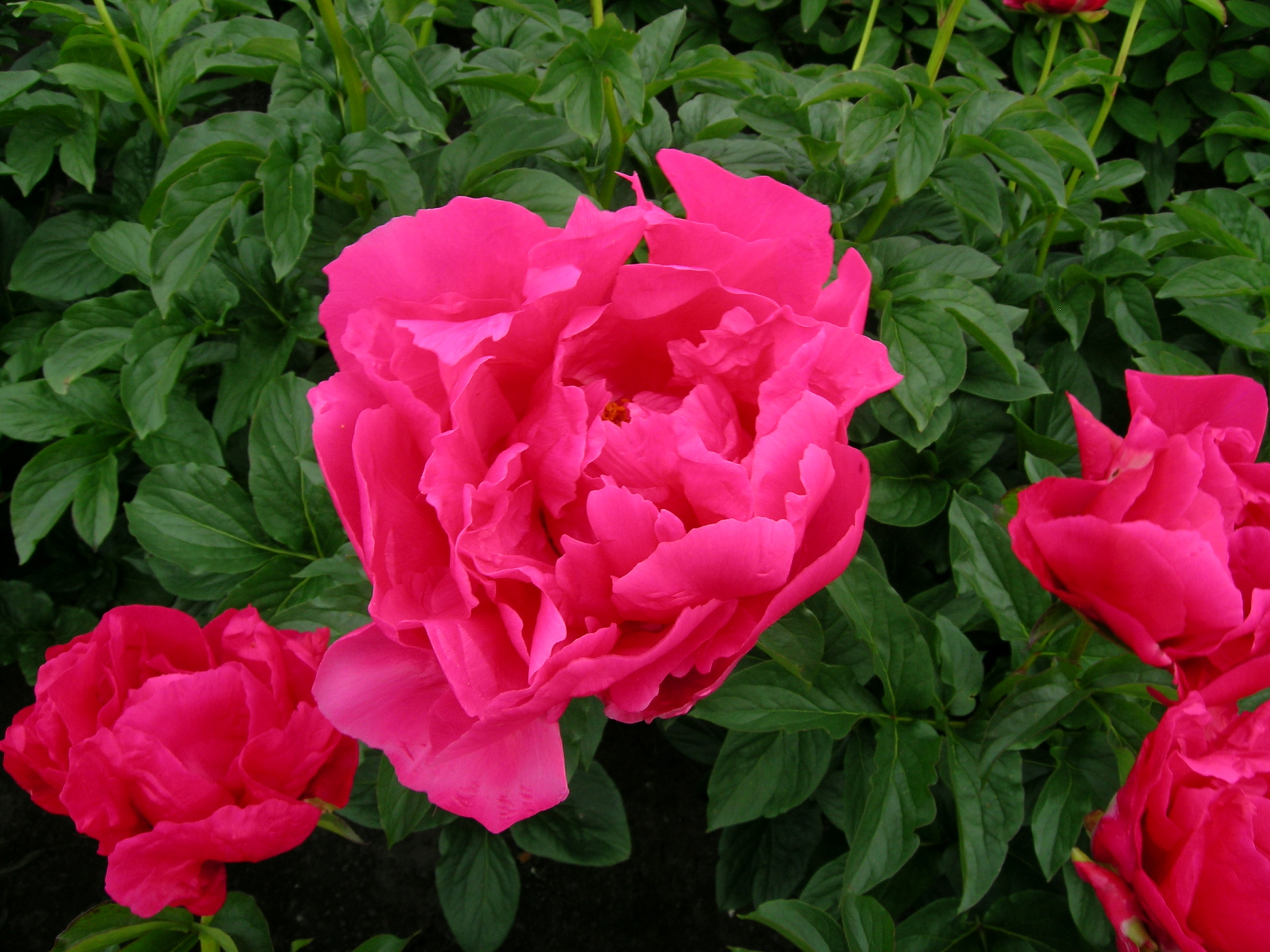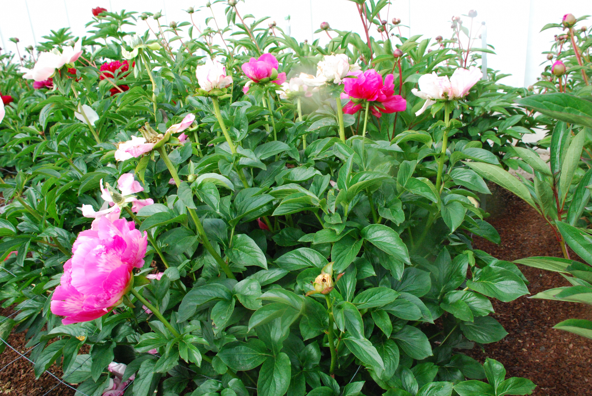 Vroege pioen, half gevulde helderroze bloemen, stevige stelen.