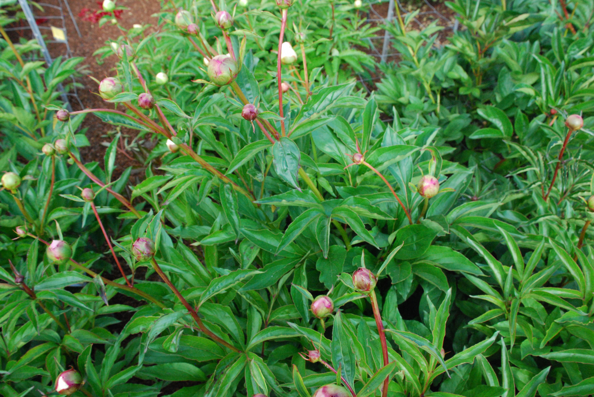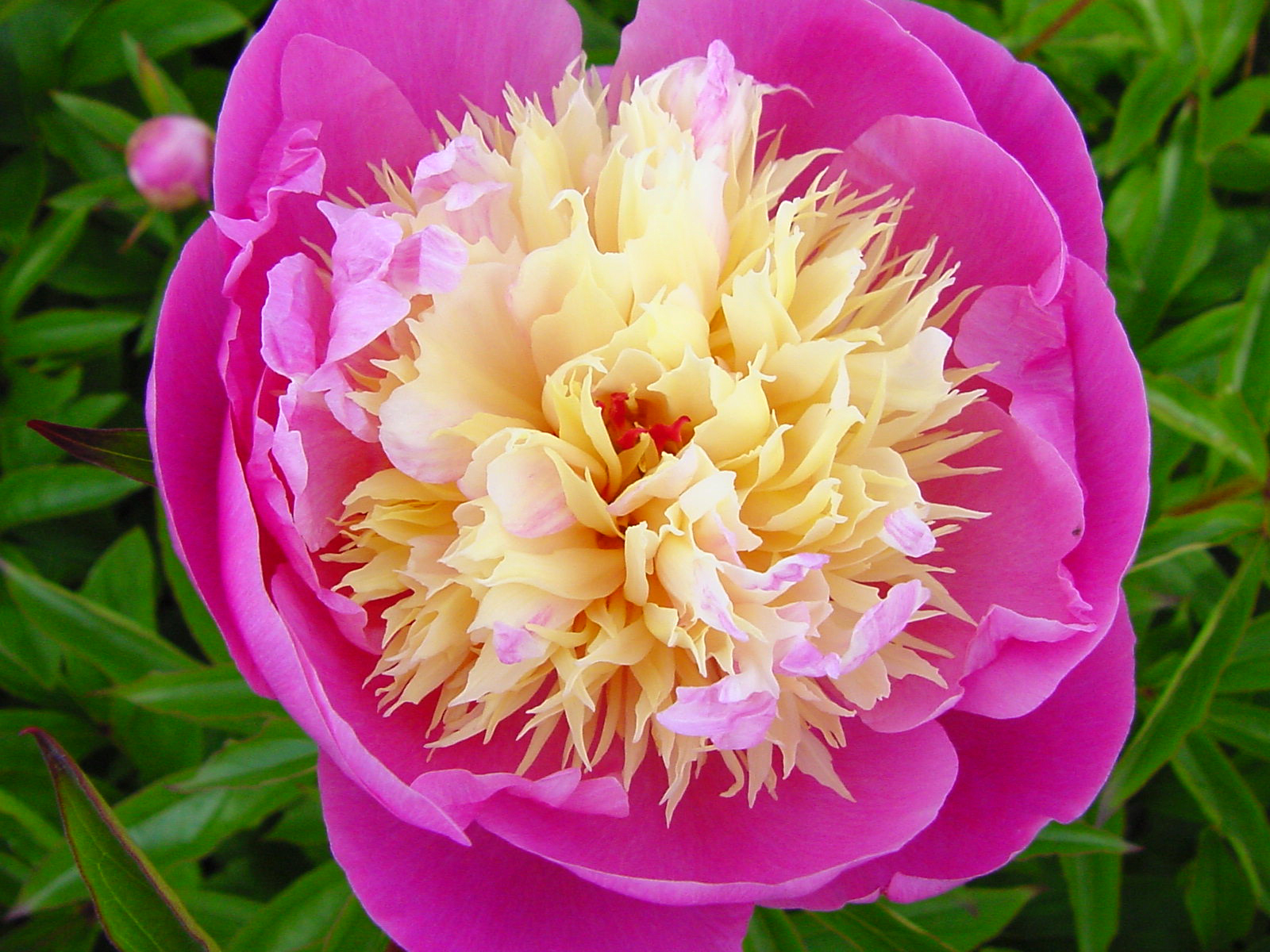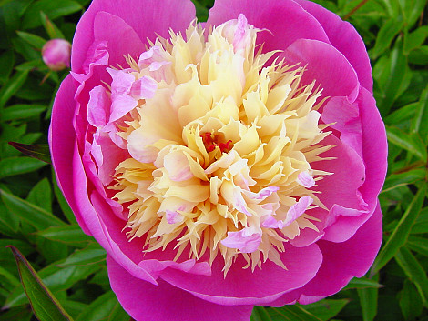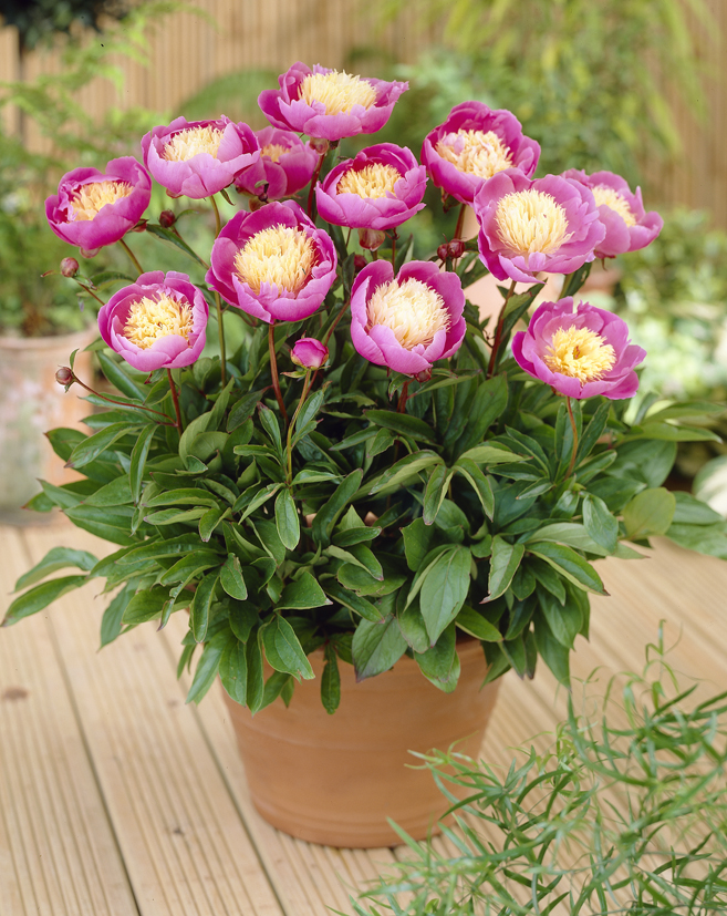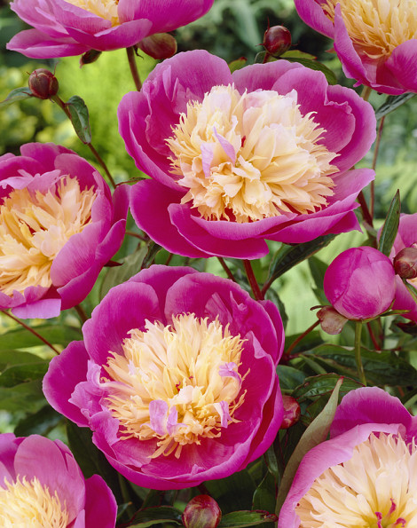 Tweekleurige pioen met stevige stelen. Ook beknd als 'Globe of Light'.