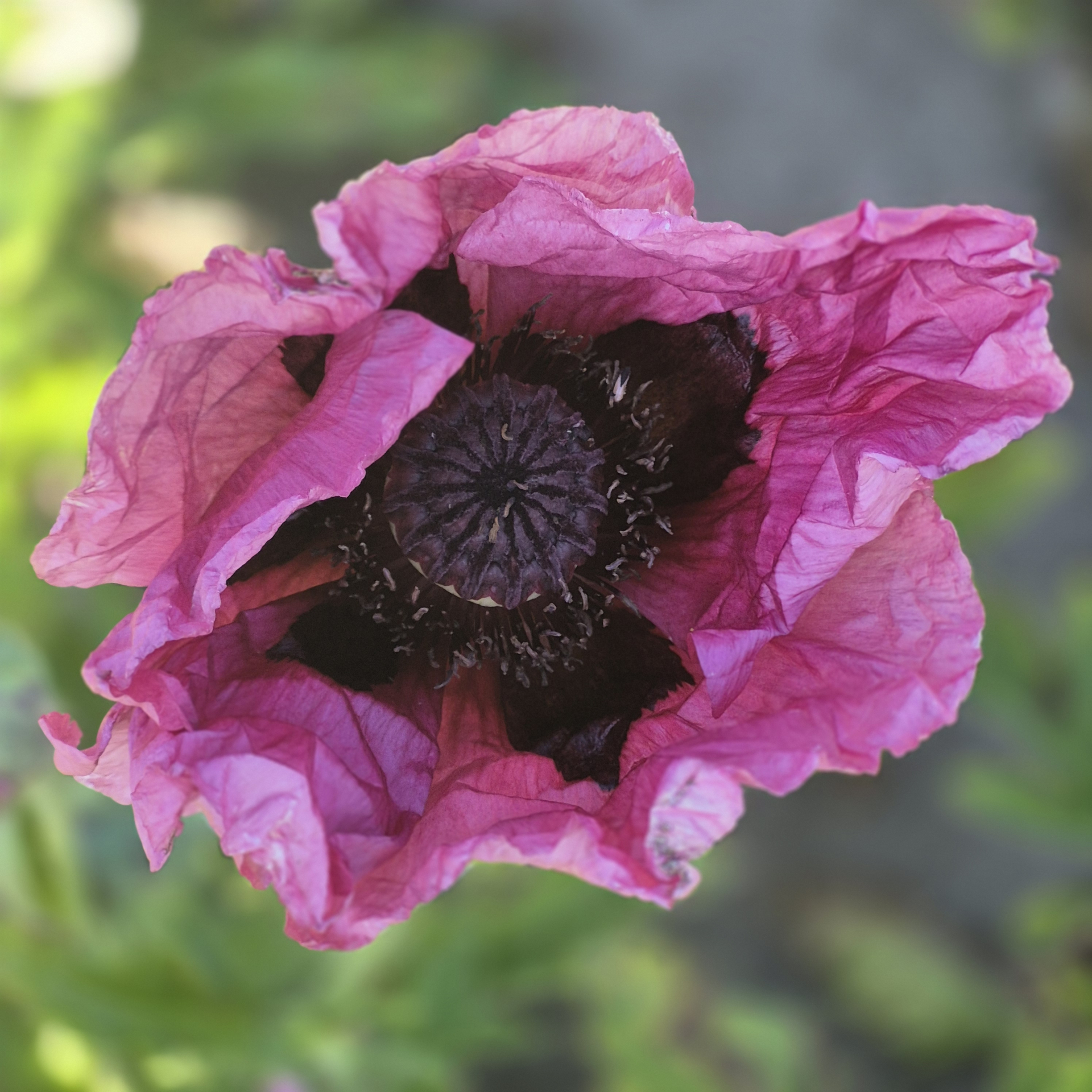 Mooie purperroze bloem met een zwart centrum.