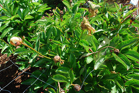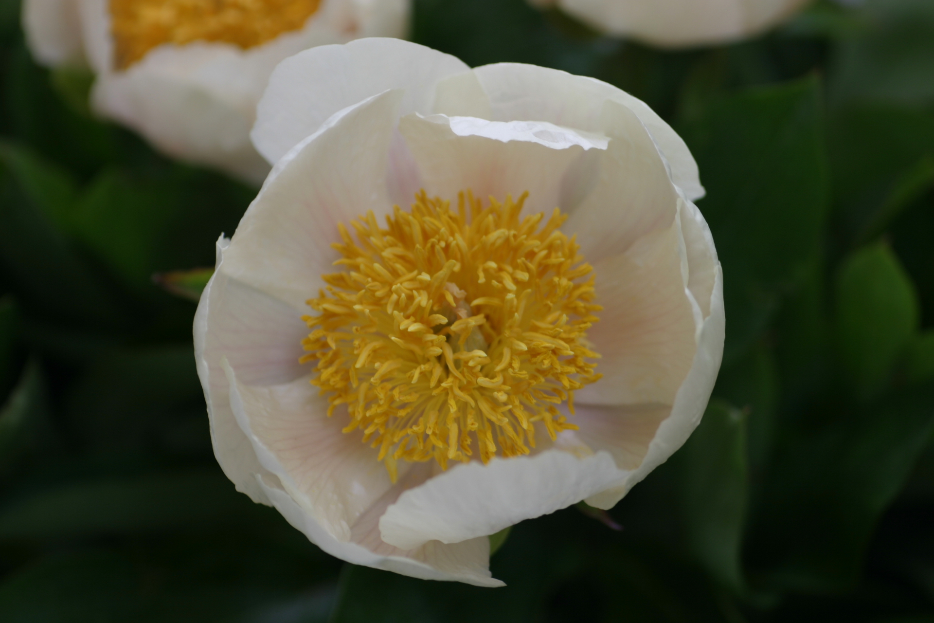 Kruidachtige pioen met sterke rechtopstaande stelen met licht geurende enkele lichtgele, later romig witte, bloemen met opvallende goudgele meeldraden.